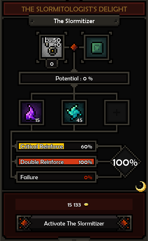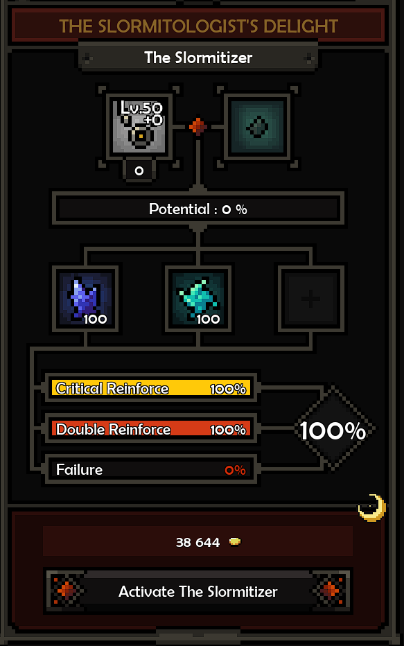 If you put any item (below) +15, and the corresponding slormite with the same tier as the current reinforcement level, the chance of reinforcing will be equal to the potential of the item. If you have leveled your item to the maximum potential (100%), you will have a 100% chance of reinforcing your item to +8.