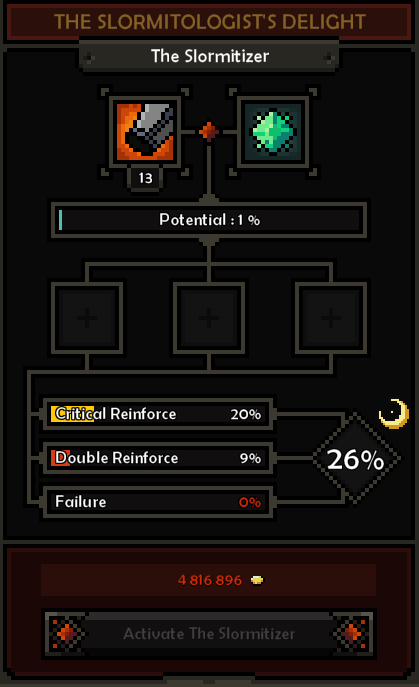Here you can see an item +13, with a T14. So the formula tells us we should have a 10% + 10% per diff tier of critical reinforcement, as well as 4% + 5% per tier. We also have a 25% chance of reinforcing as well as 1% from the potential. The cost of the reinforcing depends on the slormite tier, the type of item (normal, magic, rare, epic, legendary).