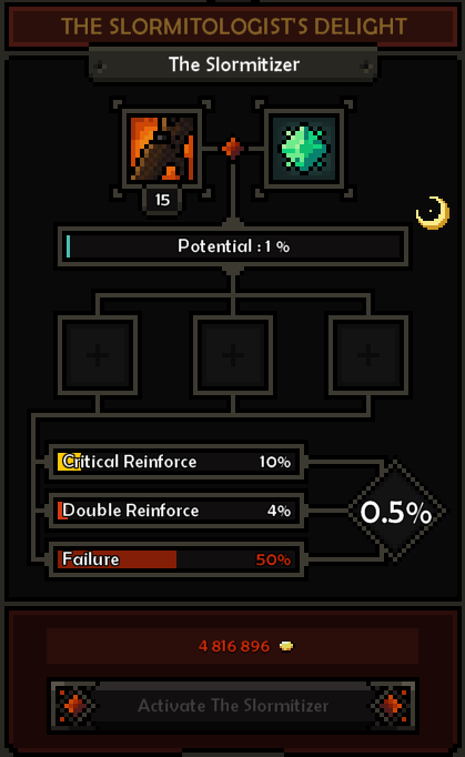 My best item right now is a +35 base amulet. In order to force a double reinforcement, I put 96 slormandrite of fate (since we got 4% of double reinforcement base chance) to achieve 100%. We need to compensate for the 96% failure chance from the fate slormandrite as well as the 50% base failure chance from the item being higher than 15 with a T14 slormite. So we put 146 slormandrite of harmony in order to reduce the chance of failure to 0. After this, we “only” have 96% chance of success, all coming from the fate of slormandrite. We add a normal slormeline to achieve a 100% reinforcement chance. (We could add 100 total fate and 150 total harmony, but it’s cheaper to add 1 normal slormeline).